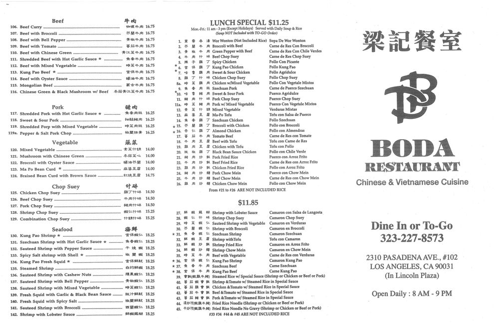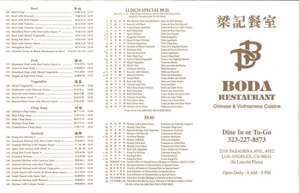 Boda Restaurant, located in Los Angeles, offers a diverse menu of Chinese-Vietnamese cuisine. Known for its delicious and flavorful dishes, Boda provides many vegetarian options and caters to various dietary needs. The restaurant boasts a friendly and attentive staff, creating a warm and welcoming atmosphere for its customers. Reviews rave about the consistent quality of the food, with favorites like broccoli shrimp and shrimp noodle soup receiving high praise. Customers appreciate the generous portions and reasonable prices, making Boda a go-to spot for both casual dining and special occasions. With a loyal following of customers returning for decades, Boda Restaurant stands out for its authentic and tasty food, earning a solid reputation in the community.
